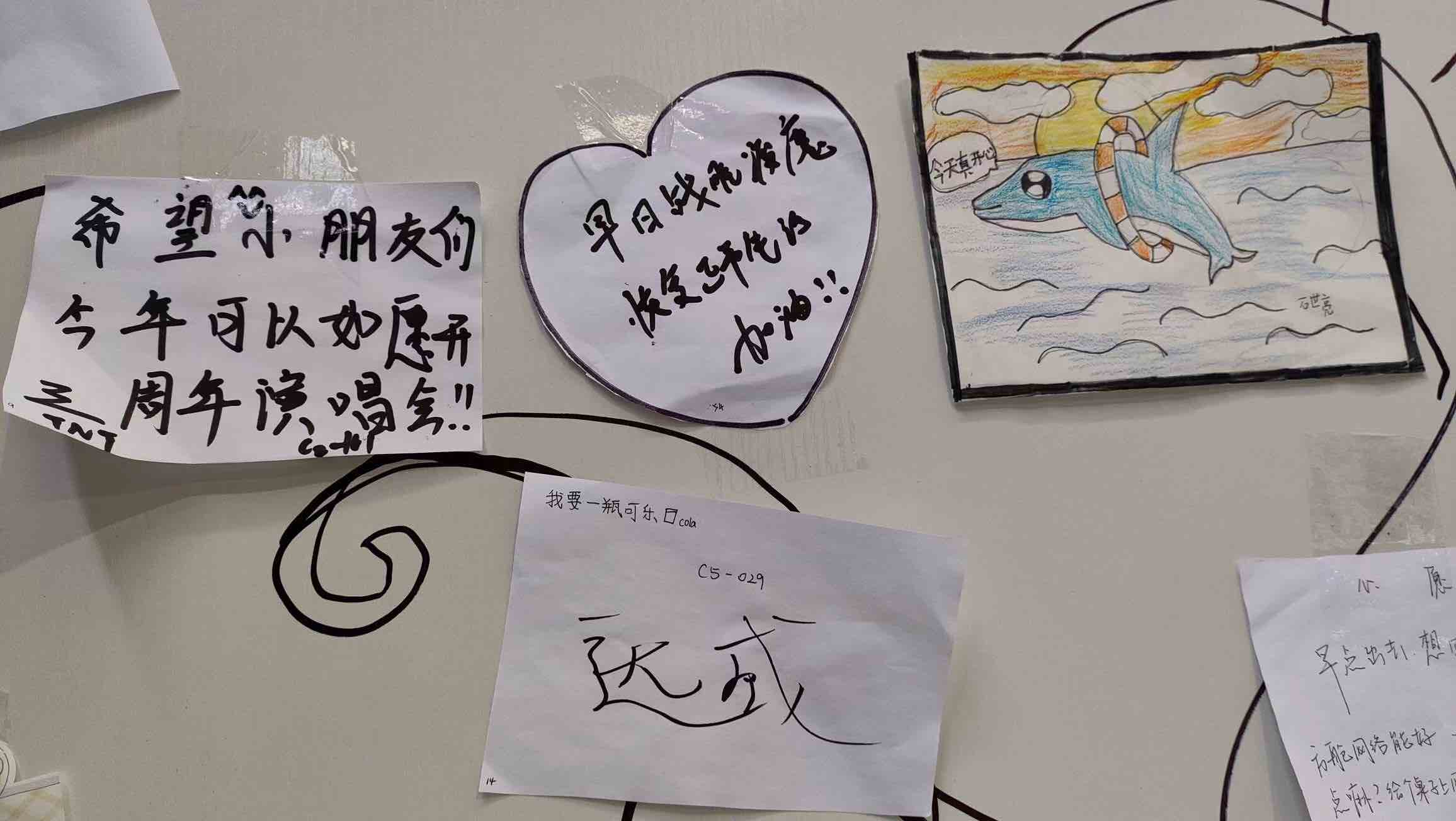一名患者留言:“我想要一家畫畫小鋪,希望大白們能幫我實現一下!薄褒埲A大白”留言回應:“請來護士站①,我們幫您實現!”
