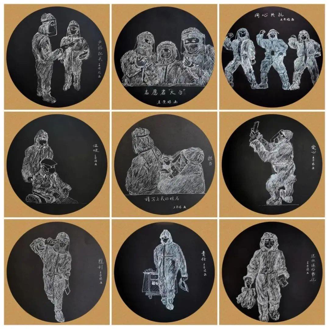 藝術來源于生活。王榮根參加志愿服務的同時,創作了不少抗疫主題作品。一筆筆,一張張,都是“情景重現”,逐漸積累,構成系列——社區黨支部書記李林珠變身“配送員”,為生活物資打通最后一百米,志愿者劉光霞擺出勝利手勢的歡樂一幕……