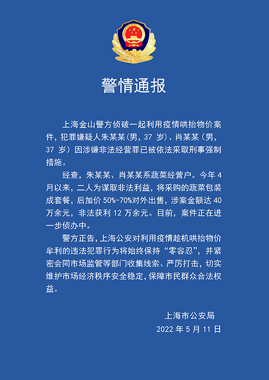 人民網上海5月11日電 (王文娟)據上海市公安局通報:上海金山警方偵破一起利用疫情哄抬物價案件,犯罪嫌疑人朱某某(男,37 歲)、肖某某(男,37歲)因涉嫌非法經營罪已被依法采取刑事強制措施。