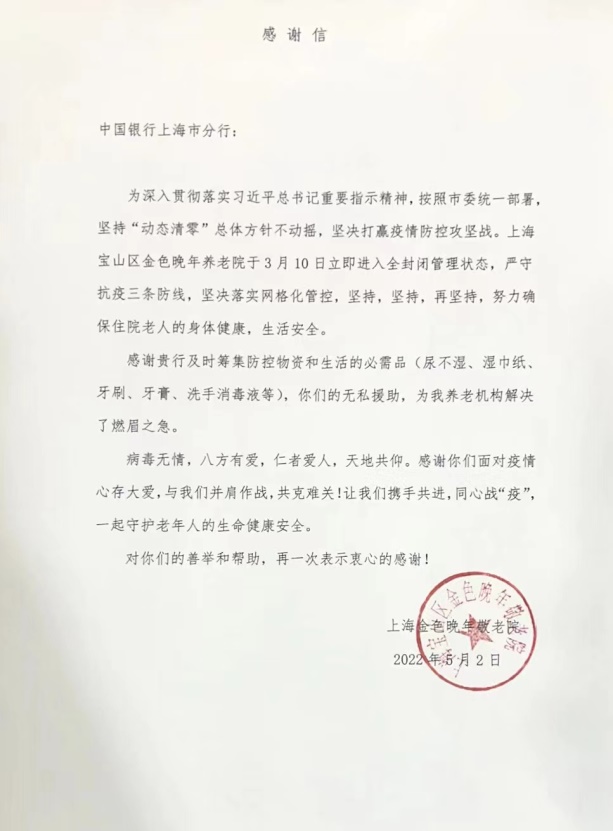為切實緩解養老機構在后勤物資保障等方面的壓力,中行上海市分行對中福會養老院、上海市第四福利院、夏陽街道養護院等60家養老機構開展慰問關懷,捐贈消毒濕巾、洗手液、成人尿片、牙刷、牙膏等 7萬余件防疫物資與長者生活必需品。上海金色晚年養老院發來感謝信表示:“感謝貴行及時籌集防控物資和生活的必需品,你們的無私援助,為我養老機構解決了燃眉之急!