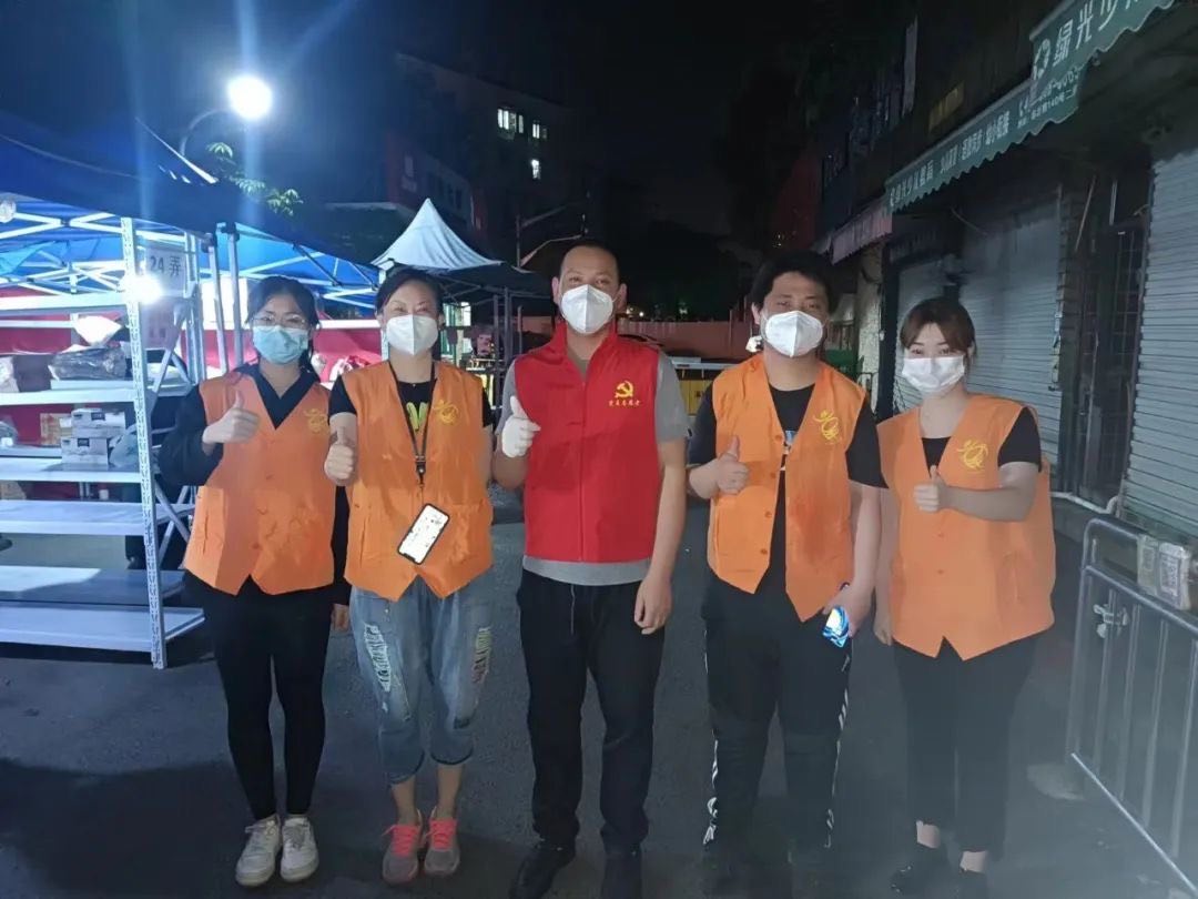 夜幕中的志愿者們,中間穿著黨員“紅馬甲”的是褚四棋。