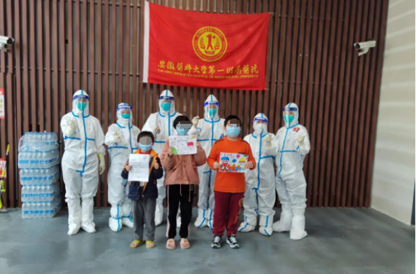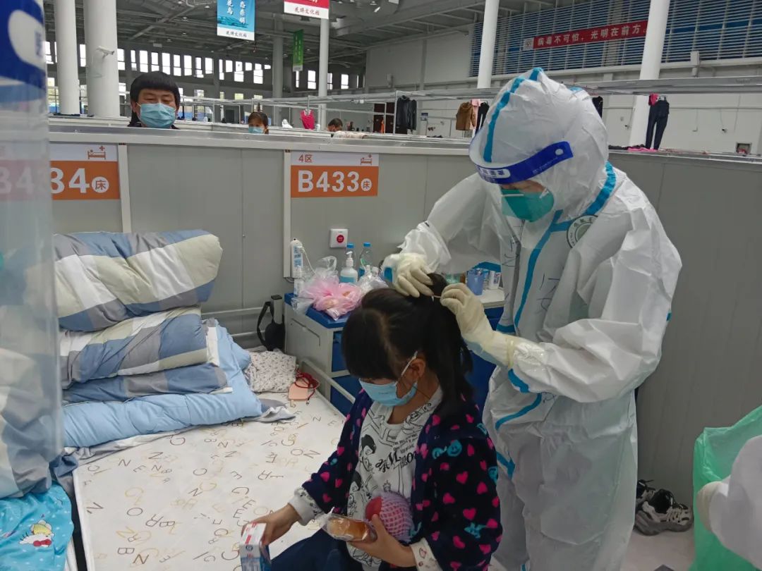 復興館方艙里還收治有不少小患者,相比成年人而言,小朋友們的情緒更加容易緊張、焦慮。為了照顧到他們,方艙里每天都會開展有趣的游戲,畫畫、唱歌、簡單的運動操……“大白”們輪流和小朋友們玩在一起。