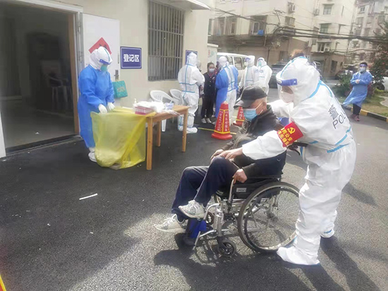 普陀公安分局甘泉路派出所民警周序香幫助腿腳不便的老人做核酸