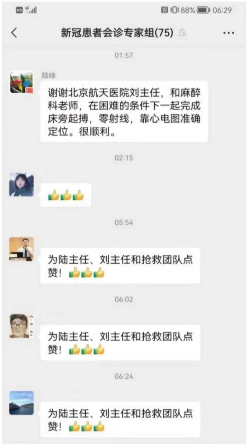 北京航天中心醫院援滬醫療隊的急診科醫生劉偉前往病區查看患者情況后,主動請纓加入搶救團隊,與同濟大學附屬上海市第四人民醫院心內科副主任陸詠一起為患者實施心臟臨時起搏器植入。