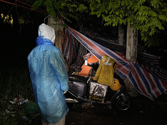 “你們是做什么的?怎么都住在這里?”經過詳細了解,原來住在這里的7人都是騎手,由于白天需要外出配送,晚上又沒有合適的固定居住場所,于是就在這個隱秘角落搭建帳篷臨時居住。民警核實確認好對方身份后,查驗了對方電子通行證以及24小時核酸檢測陰性報告,并在現場做了一次抗原檢測,結果顯示陰性。