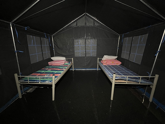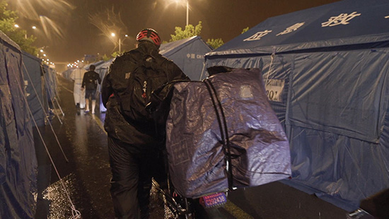隨后,這7名騎手收好帳篷、整理好行李,在民警駕車一路引導下,來到了位于綠科路羅山路附近的臨時集中安置點?吹窖矍罢R齊的近200余頂帳篷,整潔的環境,通明的燈火,7名騎手原本有點擔憂的心情立馬消失無蹤!斑@里管理比較嚴格,每次進去都要在門口做抗原檢測,每頂帳篷就住兩個人,白天還會有消殺!秉S申星還在一邊給他們進行介紹,這新來的7名騎手早已對眼前的環境滿意不已!斑@里真的太好了,早知道有這么一個地方,我們早過來了!薄罢媸翘兄x了,謝謝你們!