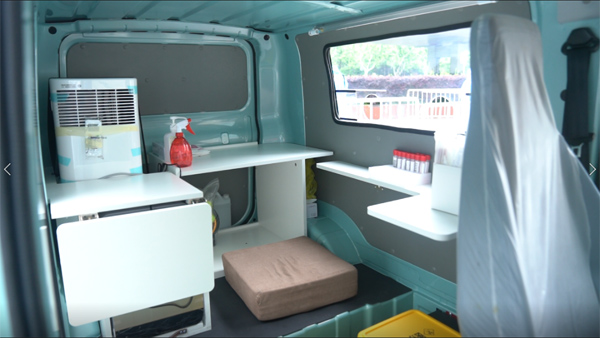 可折疊的簡易操作臺上擺放著手消、酒精、手套等一系列防護用品和消殺用品。車內配備了紫外線燈,每次車輛完成采樣任務后,可以通過紫外線對車輛內部進行消殺,確保車內環境安全。
