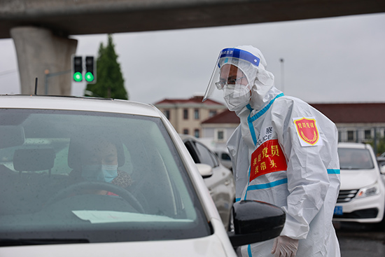 “您好,請出示通行證和核酸檢測報告!5月13日上午,第二天就要退休的書院派出所社區民警陳永官,穿著嚴密的防護服,依舊在臨港大道上設卡檢查著過往車輛和人員。按照要求嚴格檢查完畢之后,他還不忘提醒對方注意防護,如果有需要,他還會當場送點干糧給過往的貨車司機。