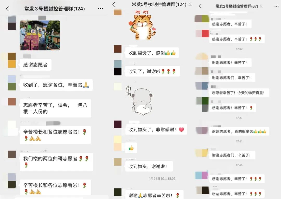 志愿者的身影中處處是感動。小區共有十棟樓,樓組長們的平均年齡在68歲,3號樓樓組長嚴老伯年近七十,不擅長使用智能手機的他,為了更好地服務居民,努力學習群通知、群接龍、小程序等各項“新科技”。從剛開始只會用紙筆記錄,已經“進步”成了群里活躍的“小靈通”。清晨時分,每收到一位居民的抗原檢測反饋照片,他都會仔細地回復一句“謝謝!”