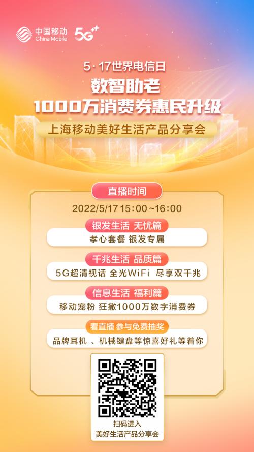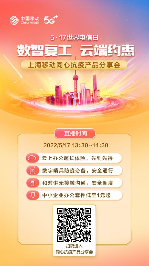 同心之城,聚力出發。上海移動還將舉辦兩場產品分享會,其中個人客戶的美好生活分享會于5月17日下午13:30舉行,帶來全新推出的銀發族孝心套餐,最低19元即可辦理,直播間還將發放1000萬數字消費券。面向企業客戶的同心抗疫產品分享會于當天下午15:00舉行,分享上海移動前期大受歡迎的抗疫和辦公信息化產品,體驗期最長可達6個月,先到先得,客戶可關注上海移動微信公眾號,回復“看直播”獲取直播路徑。