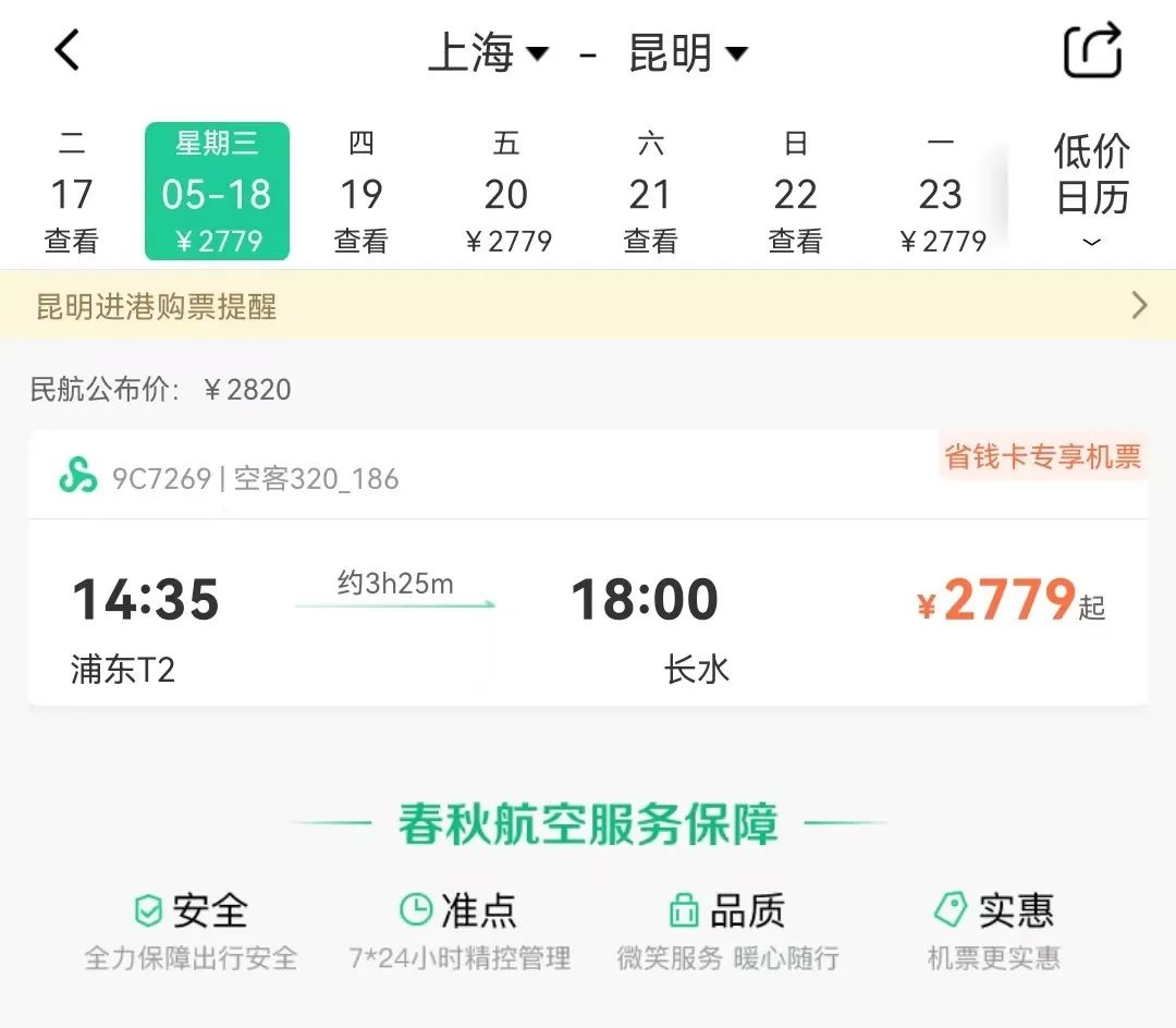 記者根據春秋航空APP查詢了解到,目前5月18日上海 ? 昆明往返航線已開放購票,其中上海至昆明的航班號為9C7269,飛行計劃是當天14點35分從上海浦東國際機場起飛。昆明至上海的航班號則為9C7270,當天19點50分從昆明長水國際機場起飛,執飛機型均為空客A320。