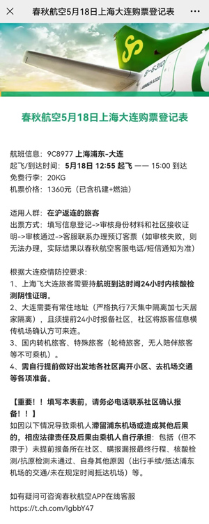 此外,春秋航班5月18日將執飛的9C8977上海 - 大連航班,也已面向所有在滬返連的旅客開放,并在春秋航空APP上開通了“5月18日上海大連購票登記專屬通道”,可享受1360元(含機建+燃油)票價和20kg免費行李托運額度(點擊文末“閱讀原文”進入登記頁面)。據了解,該航班于5月18日12點55分從上海浦東國際機場起飛。