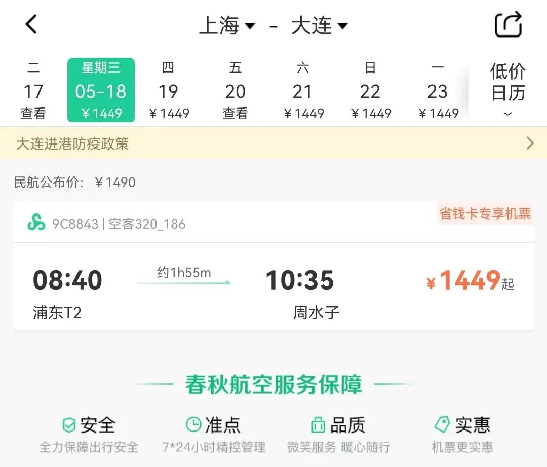 除此之外,通過春秋航空APP也可自行購買5月18日上海? 大連往返機票,其中上海至大連的航班號為9C8843,當天8點40分從上海浦東國際機場起飛。大連至上海的航班號為9C8978,當天16點50分從大連周水子國際機場起飛。