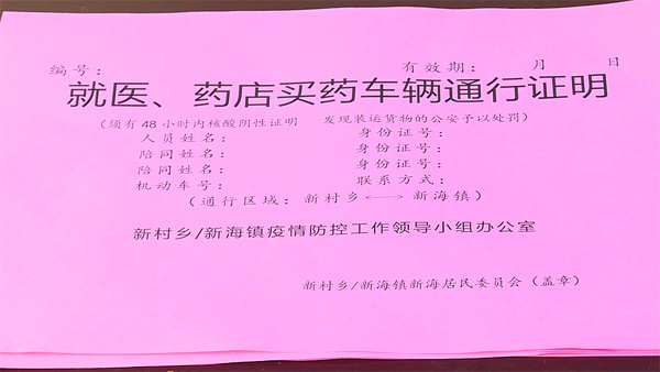 記者了解到,新海鎮、新村鄉今天實行聯防聯控有限互通開放試運行,兩鄉鎮村居民可憑出入證有序、有限互相通行。出入證由村居民向所在村居委申請,村居民須出示身份證、48小時核酸證明和健康碼,村居委核實情況后進行審核蓋章,并在出入證上標明外出事由和車牌號。出入證當天有效,可基本滿足村居民的看病、購物、探親等需求,如果有特殊情況,也可酌情延長時間。