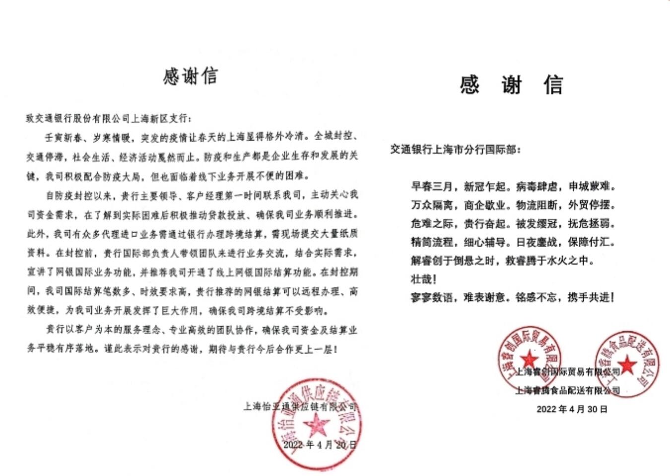 作為供應鏈綜合運營服務商,上海怡亞通供應鏈有限公司疫情期間有著大量的跨境結算需求,由于疫情封控影響,企業無法及時辦理線下跨境匯款、貿易融資等業務,交行上海市分行根據客戶業務需求,配套“零接觸”服務渠道,讓客戶真正實現“操作不見面、業務不打烊、服務不斷檔”,“正是由于交行在疫情期間為我們配套了專業的服務團隊,我們在辦理跨境金融業務時能獲得與疫情前無差異的按時、高效服務,讓我們企業能夠以最優質的服務為保障供應鏈的暢通貢獻最大的力量!鄙虾b鶃喭ㄏ嚓P負責人說道。