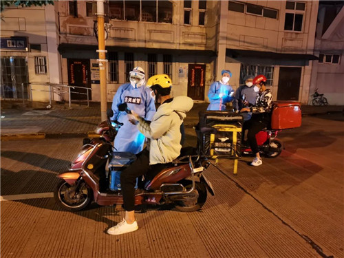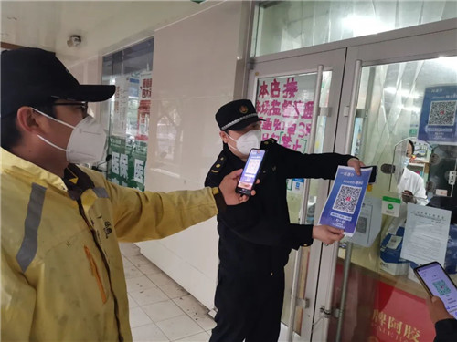 巡查中還發現一家店鋪雖為保供單位,但是店名和營業執照不匹配,遲遲無法申請“場所碼”,店鋪經營存在風險。巡查人員勸其先關閉店鋪,然后記錄下店鋪信息,報送給街道市場所,協助該店盡快落實“場所碼”申請,盡早恢復經營。連續兩個晚上,共查驗流動人員800余人次,檢查沿街商鋪、菜場、超市、快遞網點等42個,勸離人員16人次,勸關店鋪5家。