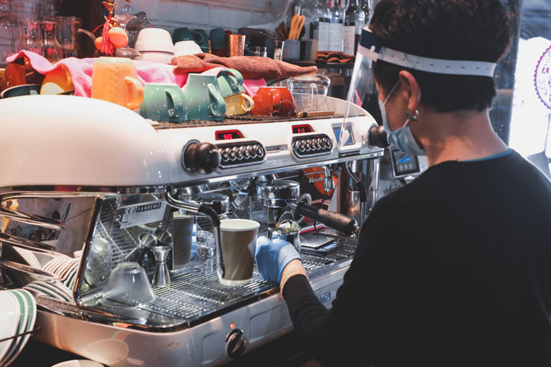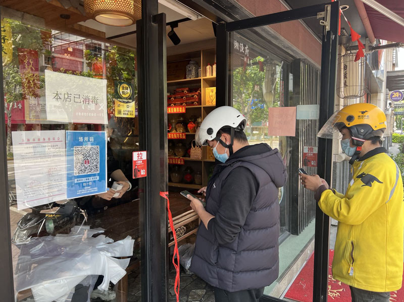 5月16日早晨,金山區楓涇鎮文中路一家咖啡店正式恢復營業,顧客進店前需掃“場所碼”核驗后進店消費。金山區委宣傳部供圖