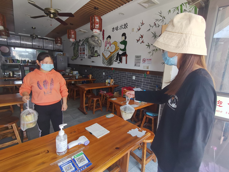 5月16日,金山區呂巷鎮金張公路上的李梓墨小吃店,市民掃“場所碼”進店,店內實行限流,顧客打包帶走。李羚攝
