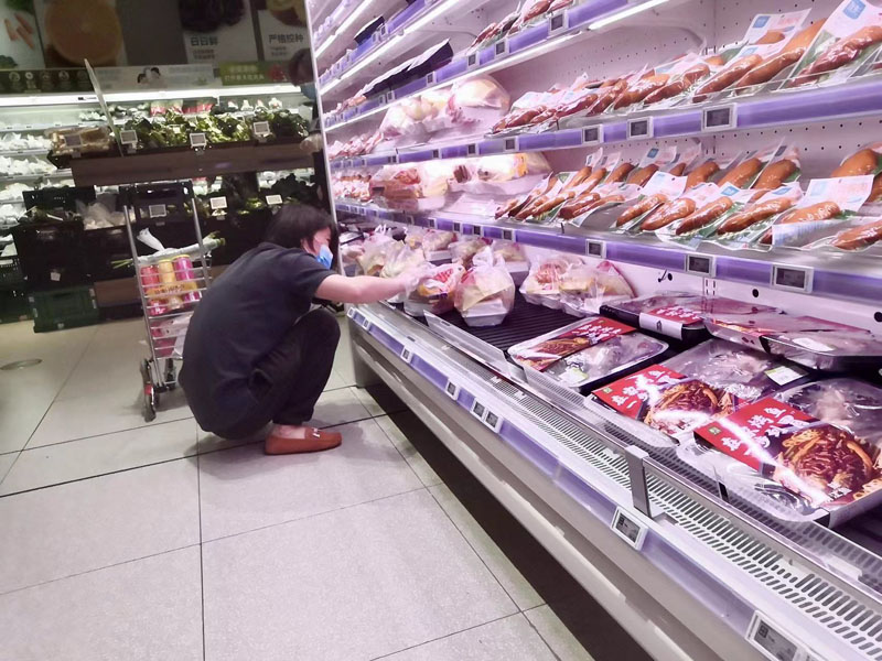 5月16日,盒馬mini虹口萬泰店的工作人員正在打包、上架新鮮的蔬菜。店內已經完成各品類補貨。圖中,消費者在挑選熟食。盒馬供圖