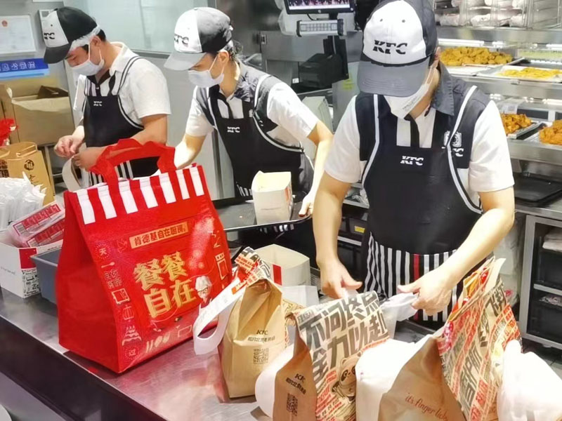 5月16日,徐家匯街道肯德基天鑰橋路餐廳為消費者準備餐食。炸雞漢堡薯條,油炸的快樂又回來了。王瑋琪攝