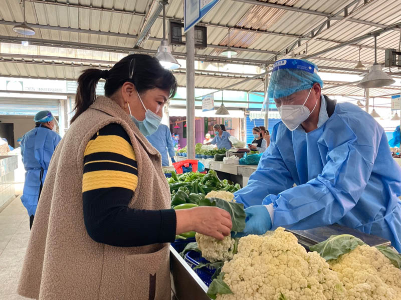 5月16日,崇明區廟鎮菜場恢復營業,市民們可以在家門口附近有序買菜了。楊宇豪攝