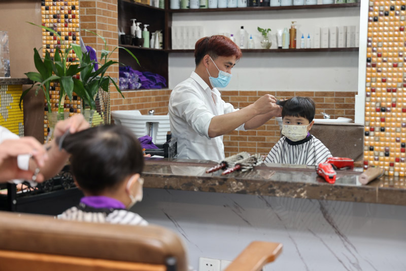 5月16日起,金山區朱涇鎮上的多家理發店恢復營業。當天上午,位于朱涇鎮的一家美容美發店中,小朋友正在理發。金山區委宣傳部供圖