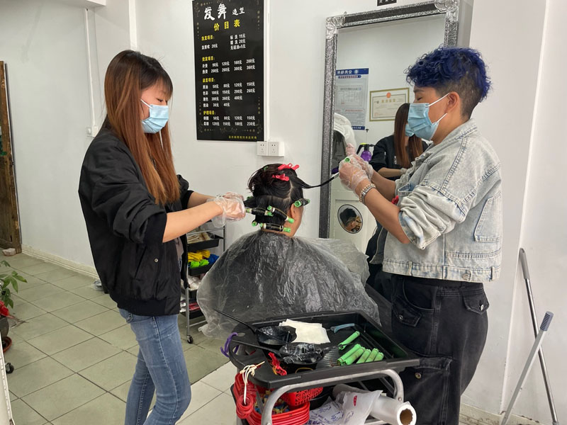 5月16日,金山區呂巷鎮新東街發舞理發店內,市民正在做頭發,理發店采取預約制。費晨陽攝