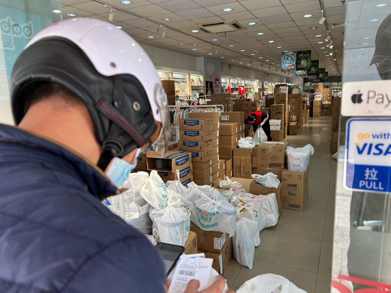 5月16日中午,位于寶山區大場鎮的一家母嬰用品超市開門營業,為母親和嬰兒的保障供應充足。周邊市民通過線上下單,騎手取貨后送至小區門口。馬作鵬攝