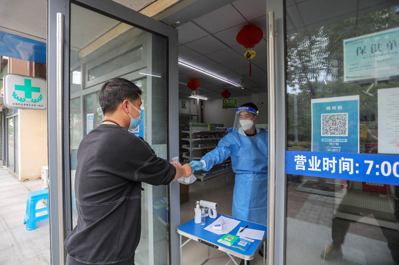 5月16日,浦東新區萬祥鎮祥安路上的一家藥店,市民掃“場所碼”購買藥品。金嘉杰攝