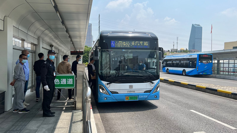 5月16日,奉賢部分公交線路恢復區內運營。圖為奉賢區南橋汽車站,市民正在有序乘坐公交。楊珺攝