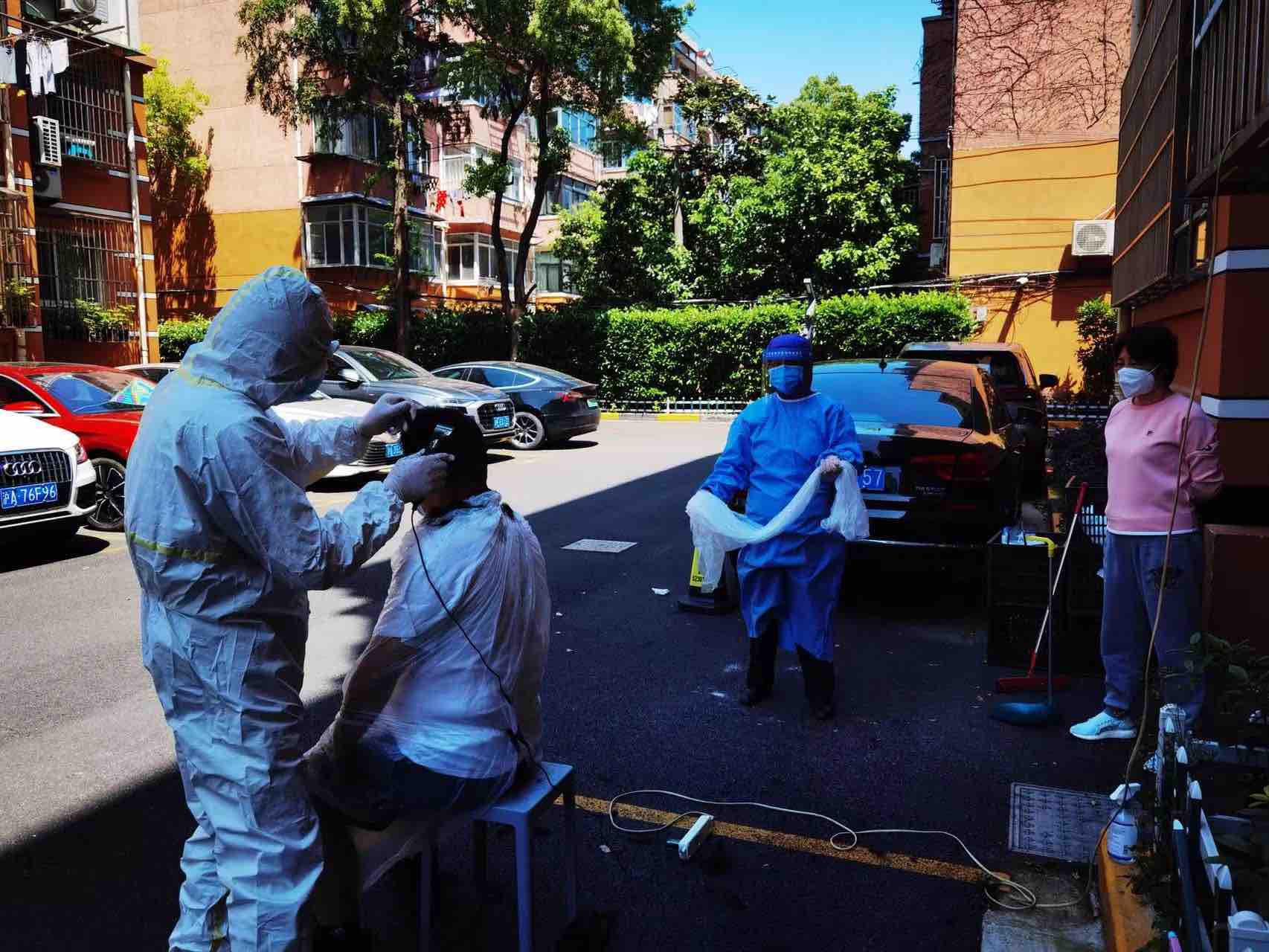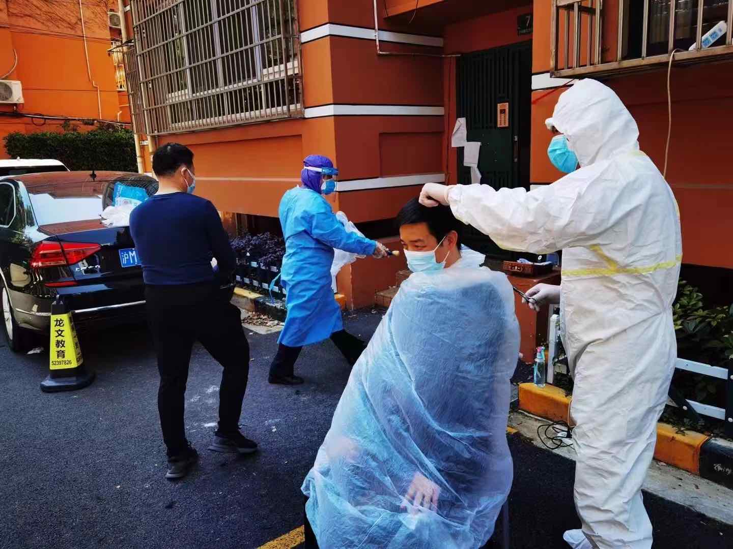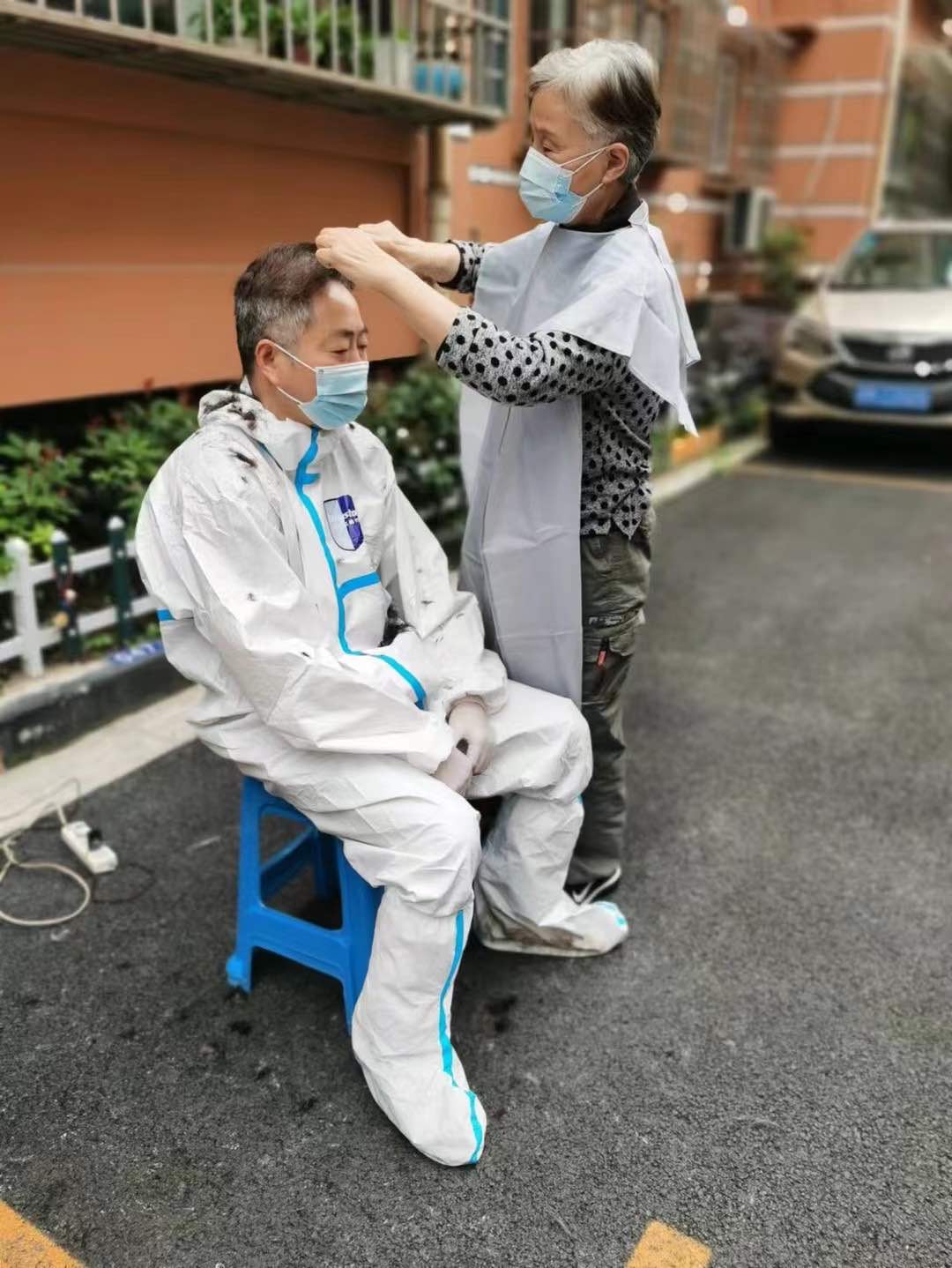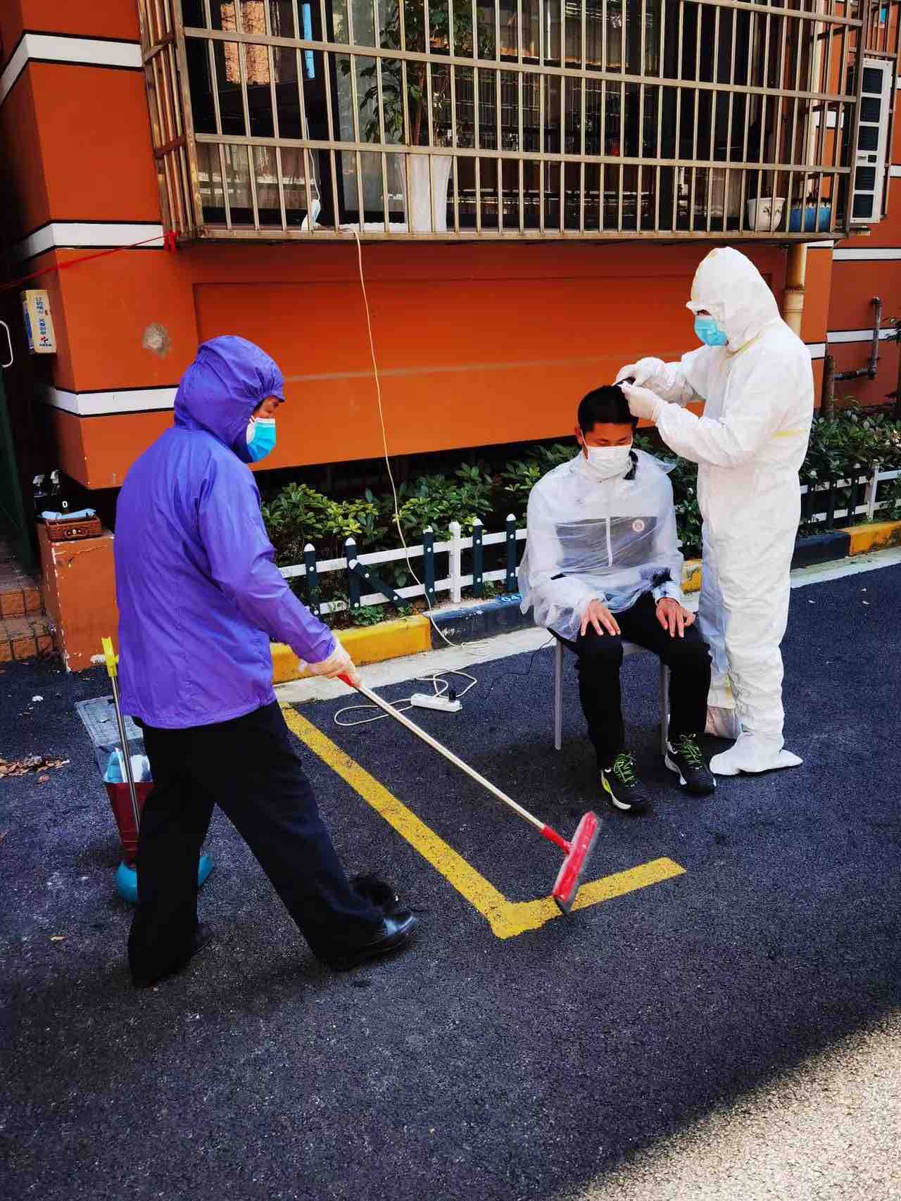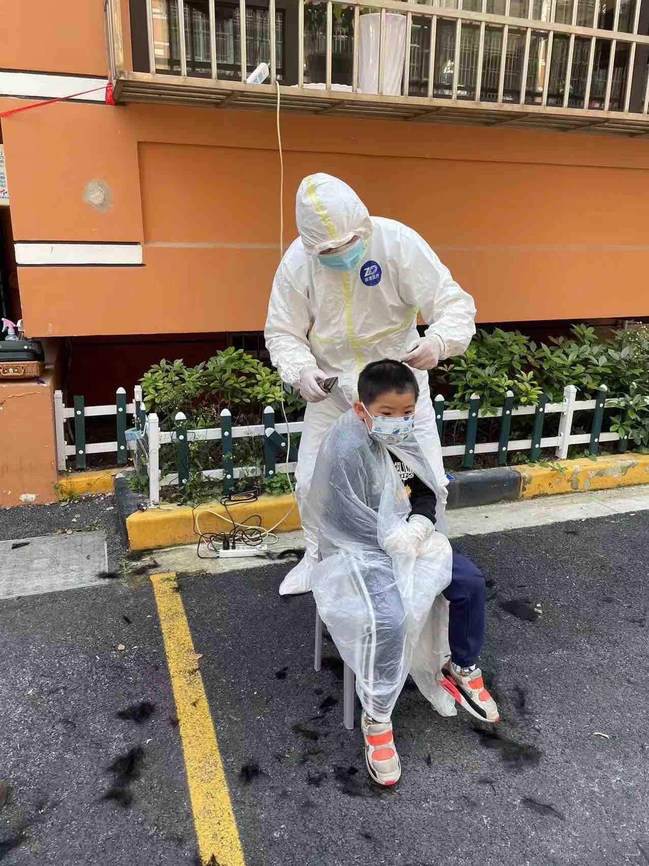 陸續有居民依次下樓排入核酸檢測的隊伍,經過這一臨時設立的“小攤位”時不免投來好奇的眼光。只見昝雯霞將一次性桌布圍在小朋友身上,用夾子夾緊,權當理發圍布,陳志強手持推剪,彎腰對著手下的小腦袋認真仔細地修修剪剪。不一會兒,小朋友的發型又恢復清爽干練。