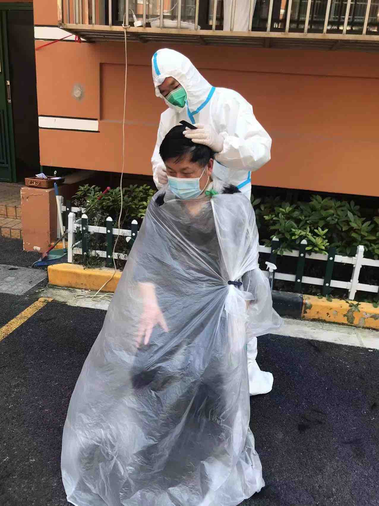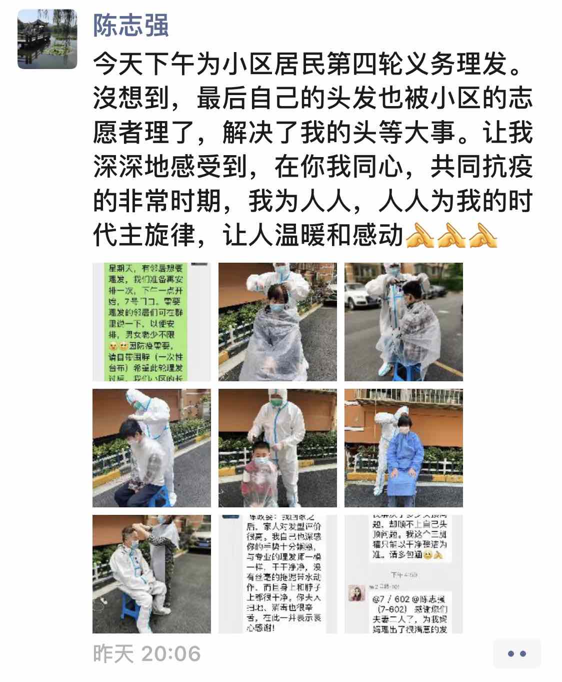 5月15日,天氣陰。中午12:30,陳志強和夫人昝雯霞帶上剪發工具準時出現在徐匯區漕河涇街道景虹花園的7號樓門口,這位“陳托尼”第四輪的免費理發服務即將開始。上午9:46,陳志強在小區物業與業主群內發布“理發告示”,其中最后一句寫道:“希望此輪理發過后,我們小區的長發能夠‘動態清零’!