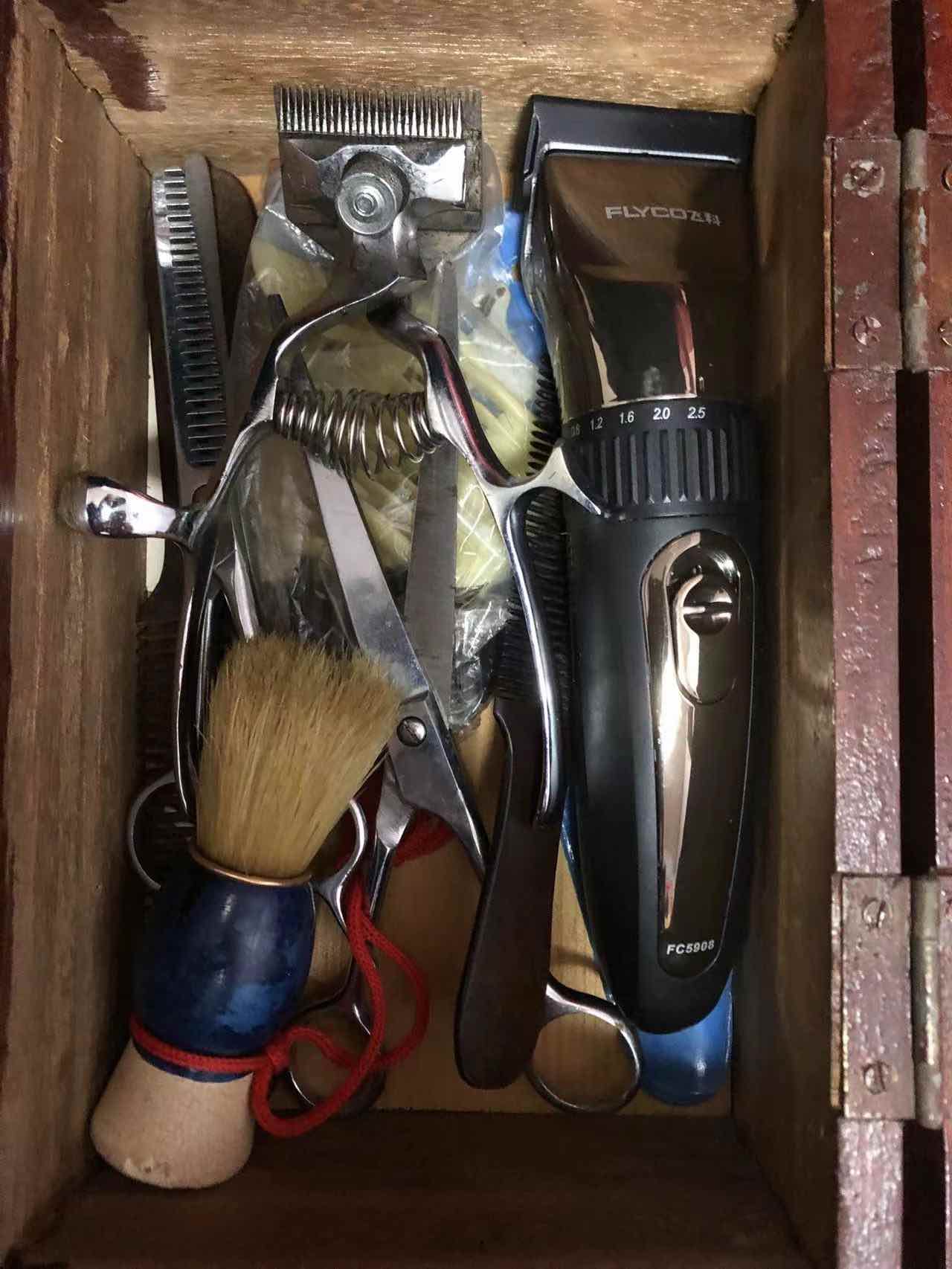 陳志強的“寶貝”們,箱子里的電動推剪是前幾日好心鄰居送來的