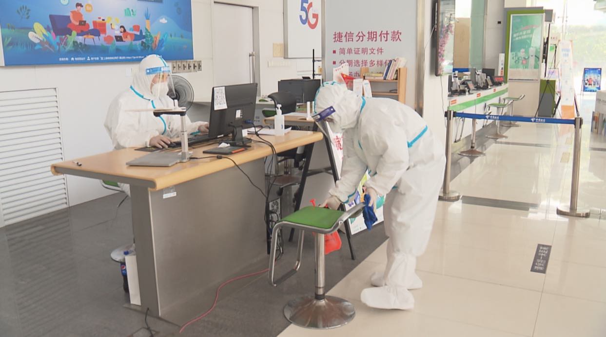 金山電信局辦公室主任 朱洪彬:如果是能線上辦理的,我們就指導他進行線上辦理,如果只能是現場辦理的,我們會通過“數字哨兵”和掃描“場所碼”登記顧客信息,再幫助顧客辦理業務。營業廳內每兩個小時會進行一次消殺,店內工作人員都要求穿好相應的防護服和面罩,做好個人防護。