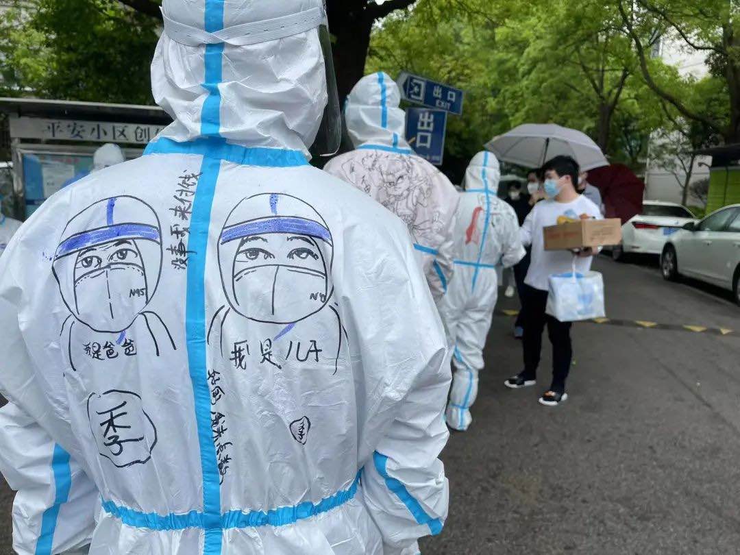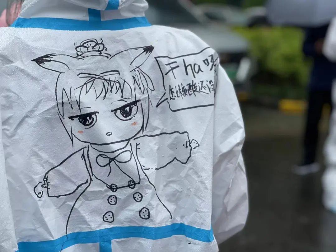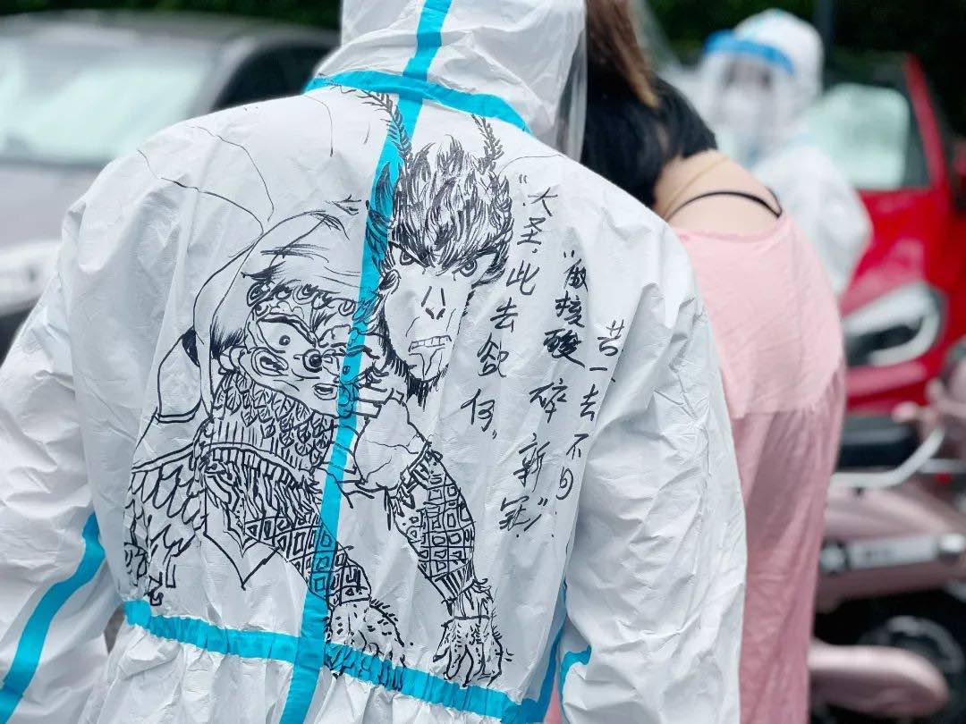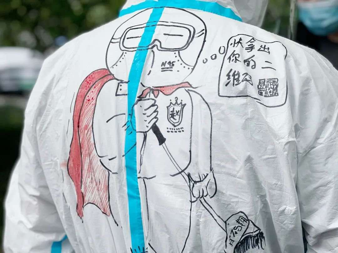 閔行區古美路街道世茗雅苑小區核酸檢測現場,辦起了一場特殊的“畫展”。這天,居民驚喜地發現,志愿者防護服背后多了一抹別樣的色彩——龍貓、多啦A夢、馬里奧、齊天大圣等許多耳熟能詳的卡通人物也來為大家“加油鼓勁”了。