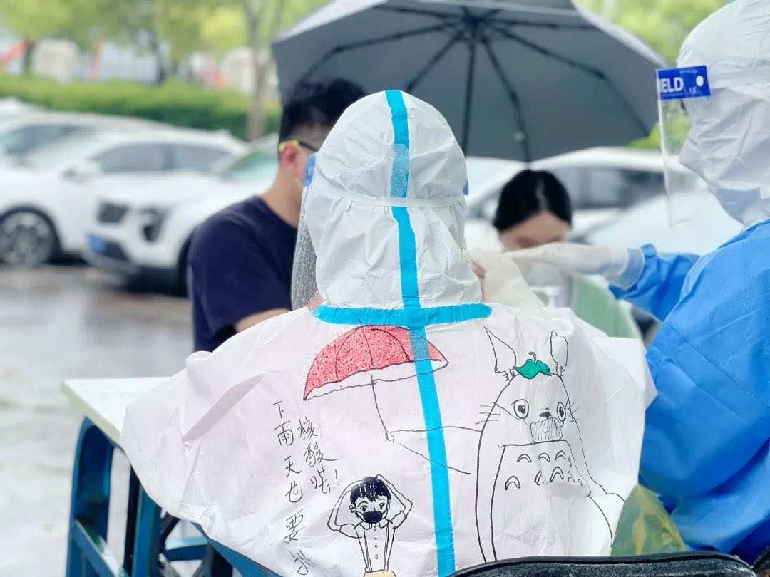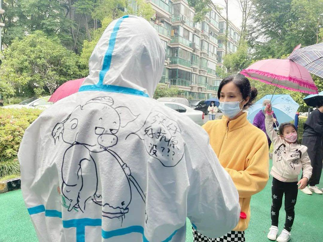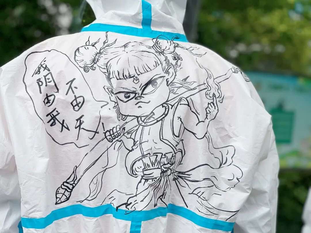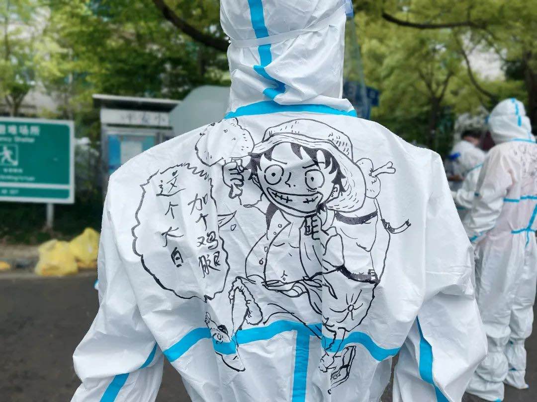 閔行區古美路街道世茗雅苑小區核酸檢測現場,辦起了一場特殊的“畫展”。這天,居民驚喜地發現,志愿者防護服背后多了一抹別樣的色彩——龍貓、多啦A夢、馬里奧、齊天大圣等許多耳熟能詳的卡通人物也來為大家“加油鼓勁”了。