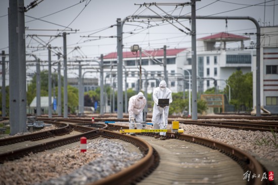 上海地鐵維護保障有限公司工務分公司作業人員正推著檢測儀,在軌道上查驗軌道參數。