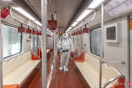 上海地鐵物業管理有限公司工作人員正在對車廂內部進行消殺,所有列車出庫前,都會進行一次全面消殺。