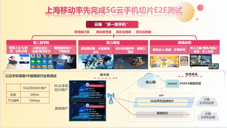 上海移動基于5G切片賦能云手機業務,5G云手機使用更為流暢,沖浪體驗升級至“服務器級”。通過URSP終端、無線、傳輸、核心網構筑端到端切片能力。網絡忙時在保障切片下,時延200ms,帶寬10Mbps,MOS分4.5左右,性能提升50%,切片用戶幀率提升達2倍至30fps,并實現“0”卡頓體驗。