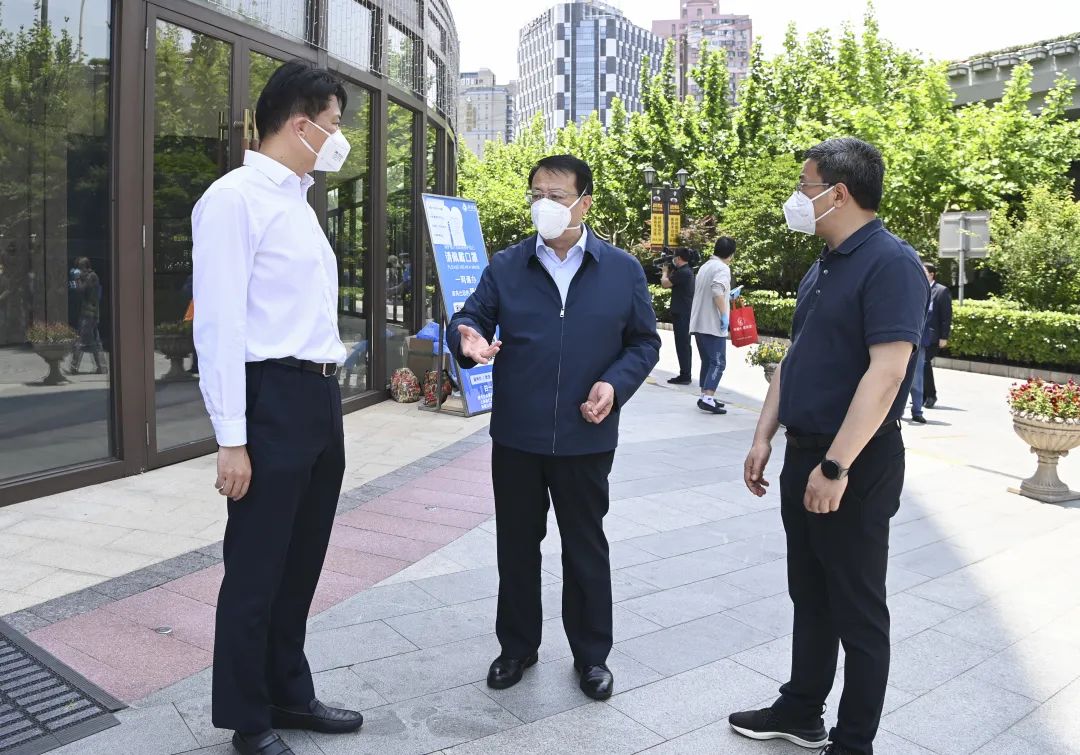 龔正一行來到普陀區長風新村街道,實地察看街面商店開放營業和人員活動情況,聽取防范區有序有限放開情況介紹。在上海環球港露天廣場上,居民們保持間隔、耐心排隊,依次掃描場所碼后進入華潤萬家超市購物。龔正詳細詢問超市人流量、疫情防控措施執行等情況,要求有序推進超市、菜市場、藥店、理發店等基本生活業態開放,設置好場所碼和“數字哨兵”,嚴格落實好個人防護、錯峰限流、排隊通道等措施,引導群眾主動配合做好測溫、掃碼、亮碼等工作,并定時進行環境消殺。