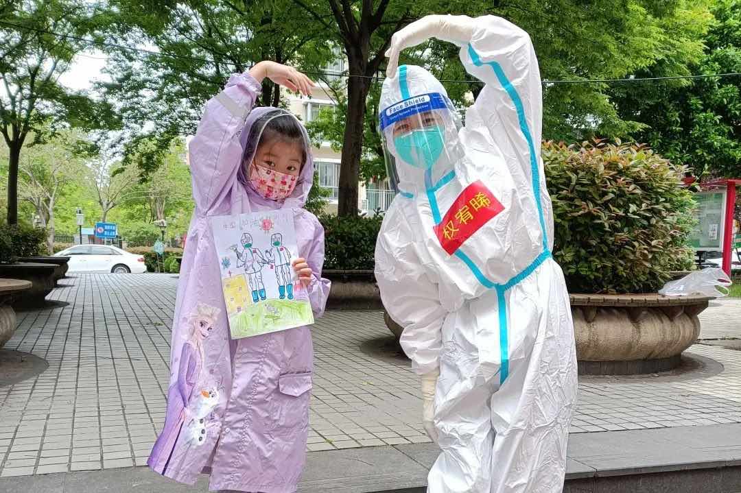 “哥哥姐姐,我有幅畫想送給你們。謝謝你們!”世博家園十四街坊的7歲小朋友張馨童把自己畫的一幅大白志愿者的手繪漫畫送給了4月27日前來支援核酸檢測的浙江大學醫學院附屬口腔醫院的醫生們。