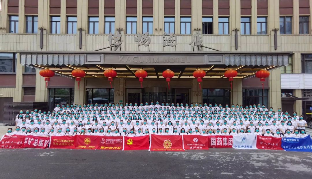 國務院國資委援滬聯合醫療隊的320名隊員在駐地外合影留念