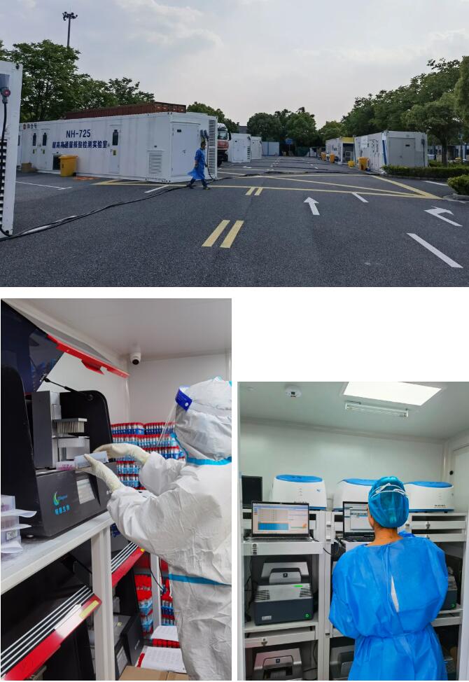 和合診斷移動方艙實驗室于4月13日抵達上海。在寶山區政府及各部門的大力支持下,經過連夜冒雨奮戰,方艙基地于4月15日即具備了日檢測10萬管的產能,并于當日投入工作。