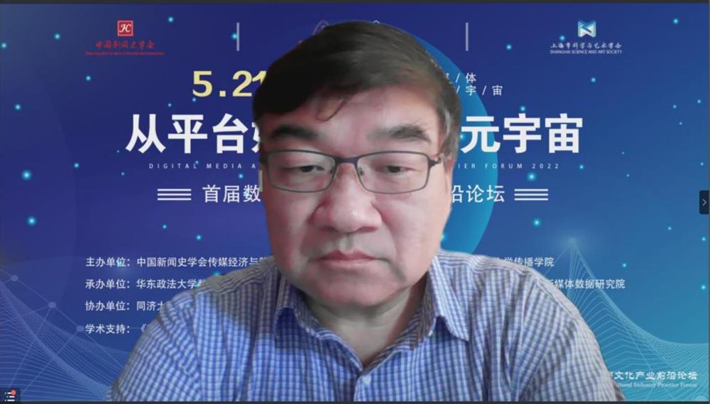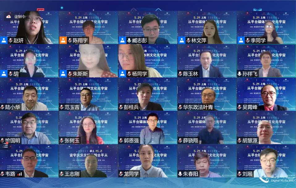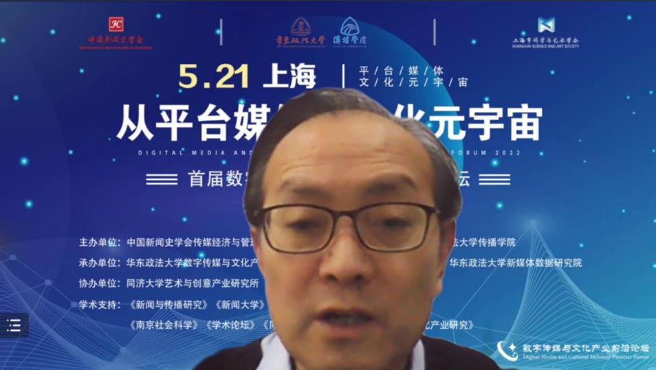 人民網上海5月22日電 (葛俊俊、林文萍、朱斯斯)5月21日,由華東政法大學傳播學院聯合中國新聞史學會傳媒經濟與管理專委會、上海市科學與藝術學會主辦,以“從平臺媒體到文化元宇宙”為主題的首屆數字傳媒與文化產業前沿論壇(以下簡稱“前沿論壇”)在線召開。來自清華、北大、北師大、中國社科院、復旦、交大等國內外60多所高校的專家學者以及60余位企業嘉賓就論壇主題進行了深入的研討。