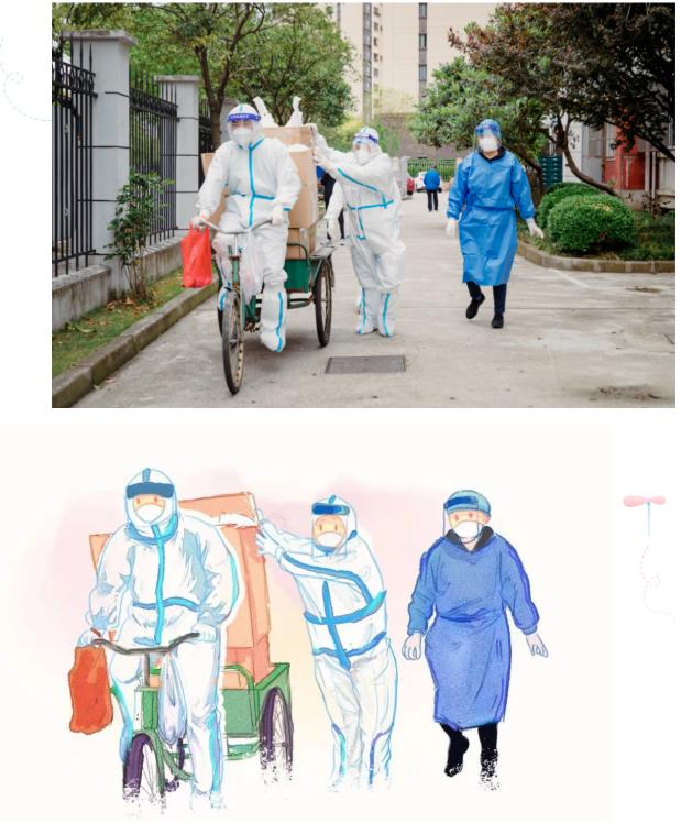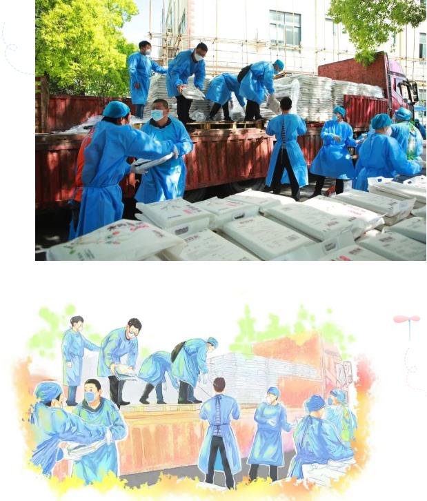 穿戴整齊的志愿者和工作人員,正齊心協力地把上百箱生活物資搬下車,再經過清點分類,按照區塊專人運送,發放到每一位居民的手里。