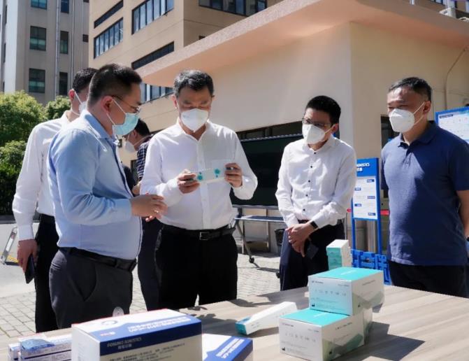陳杰首先來到復星診斷,查看企業復工復產推進情況,了解公司研發的抗原檢測試劑盒、采樣儀器等產品,聽取企業科學抗疫、科技抗疫的實際舉措。陳杰指出,隨著復工復產的推進,核酸檢測和日常工作開展息息相關,要進一步以技術為依托,提高檢測質量,提升效率,保障準確率。下階段,要繼續以常態化手段抓好疫情防控和復工復產工作,始終保持清醒認識,以更高標準做好相關工作,區委區政府會進一步做好服務保障,解決企業“急難愁盼”問題。