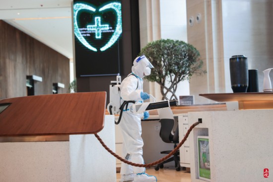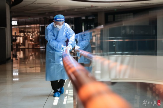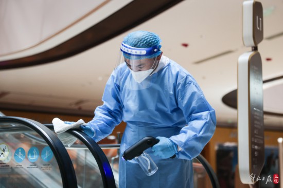 該商場駐場閉環團隊有條不紊地進行復工復市準備工作,并對商場、辦公樓的各公共區域進行整體環境保潔和消殺。