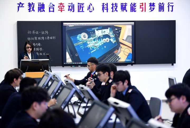 2022年4月29日,在西安鐵路職業技術學院,學生在動車組VR智慧課堂上模擬檢修。新華社記者 李一博 攝