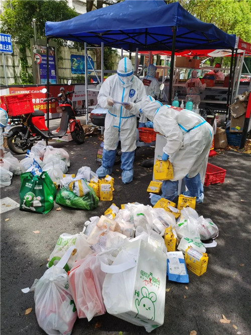 快遞運送的最后100米是保障居民們飲食起居的關鍵。下沉力量中的許多人都是學校教師,為了保障教學工作正常進行,依據教師志愿者們的課程安排,萬虹婧制作了快遞運送排班表。志愿者們每天中午一次、晚上一次,風雨無阻地為居民們運送生活物資。