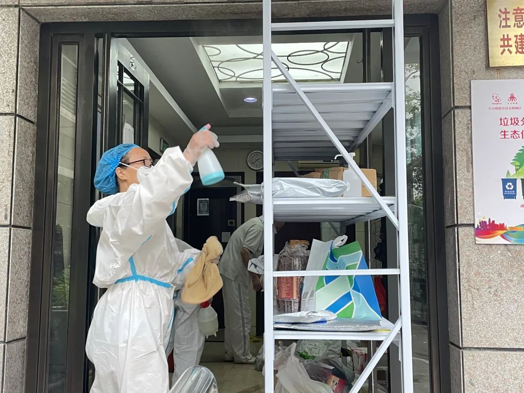 除了對公共區域進行深度清潔,對于進入小區的物資和快遞也會進行兩次消毒。在進入小區前,工作人員和志愿者們會對物資和快遞進行首次消毒;對于存放在貨架上的快遞和即將送到居民手中的物資,還會二次消毒并進行靜置,以確保居民的安全。